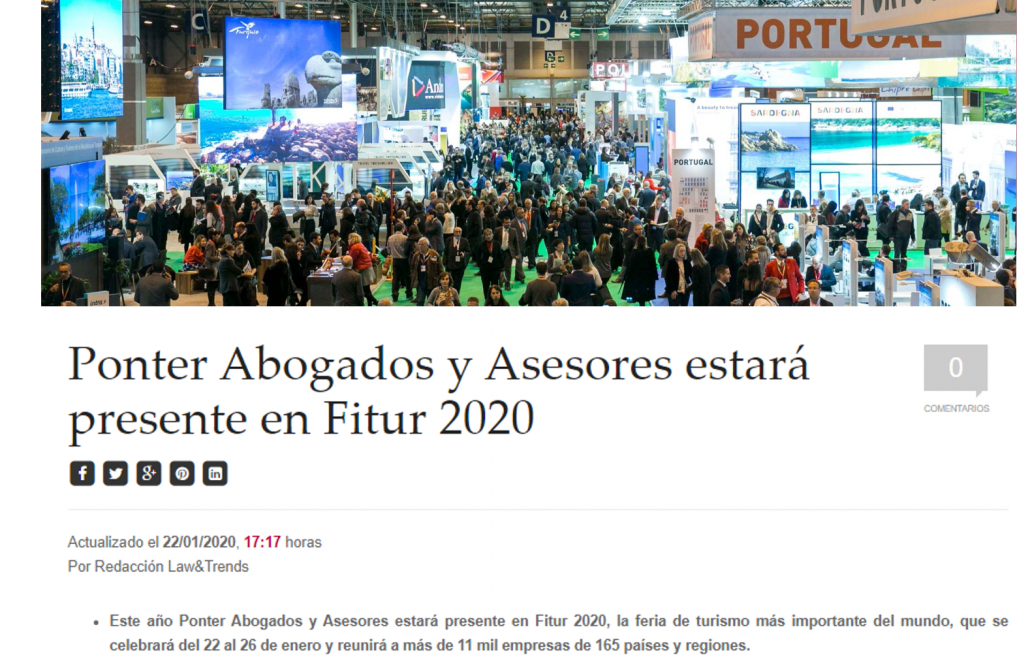 El medio Law & Trends se hace eco de la participación de nuestro despacho en Fitur 2020, en un artículo que evidencia la importancia de que las agencias de viajes cuenten con una asesoría especializada en material legal, fiscal y contable. «La implementación de las nuevas tecnologías son un factor diferencial, por ello Ponter pone […]