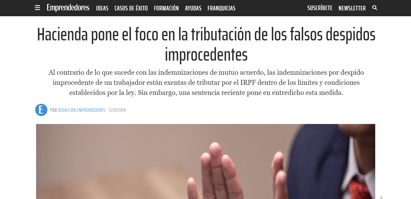 A propósito de la sentencia dictada por la Sala de lo Contencioso-Administrativo de la Audiencia Nacional el pasado 3 de julio de 2019, la revista Emprendedores publicó un artículo sobre la Tributación de los falsos despidos improcedentes.