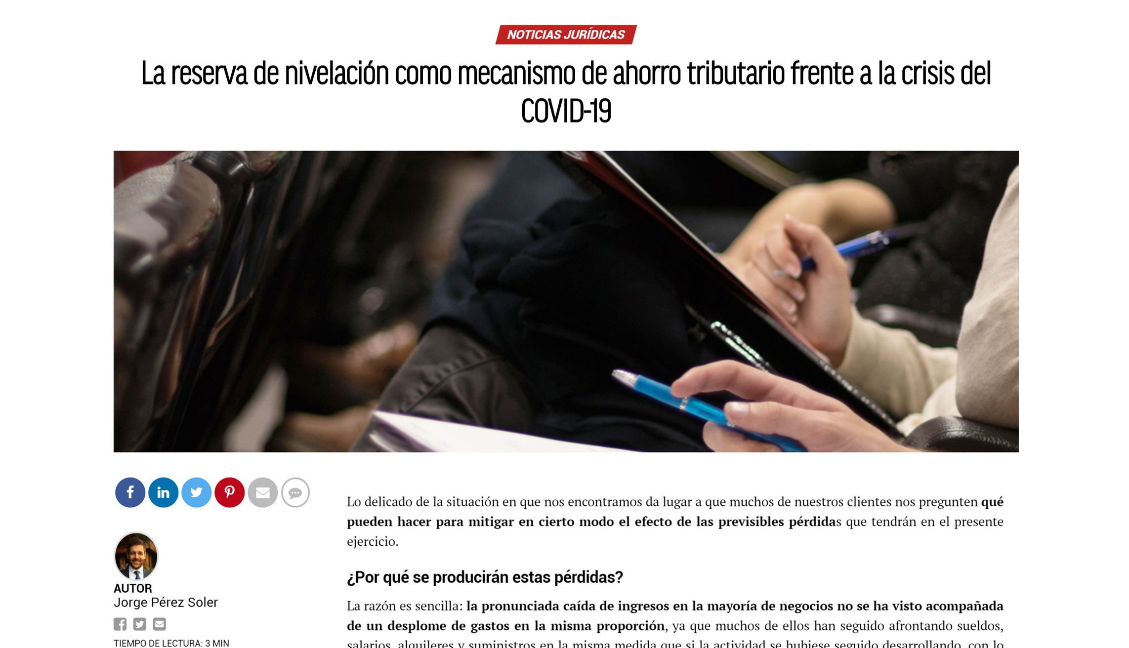 Hoy el medio Economist & Jurist publica un artículo de nuestro compañero Jorge Pérez Soler, abogado del despacho, en el que explica la reserva de nivelación como mecanismo de ahorro tributario frente a la crisis del COVID-19.